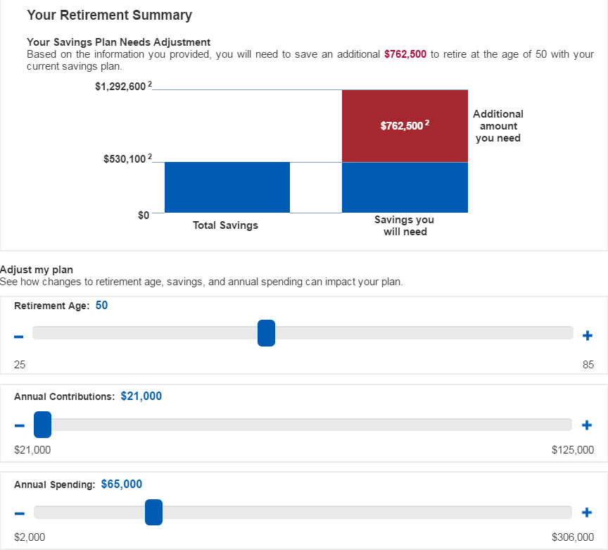 My current spending per year (that isn’t debt payment) is around 55% of my gross income. That’s around $85,000 for a family of 4. I’m planning to reduce that to $65,000 per year which is much more reasonable (this will also free up more cash flow as we move in that direction). With my current yearly contributions of $21k and planned retirement age of 50, I’m told I have a shortfall of $762,500.